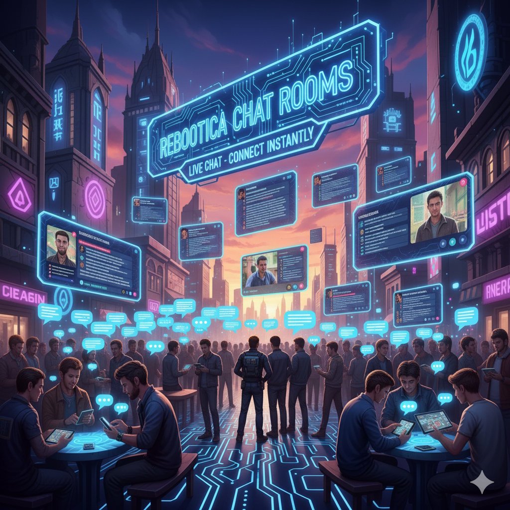 Chat Rooms: Multiple holographic text windows showing real-time, direct conversations between user icons, symbolizing the Rebootica chat rooms.